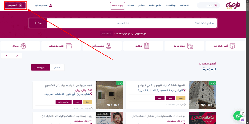 1- ادخل على الموقع الالكتروني واضغط على (أضف إعلان) كما هو موضح بالصورة.