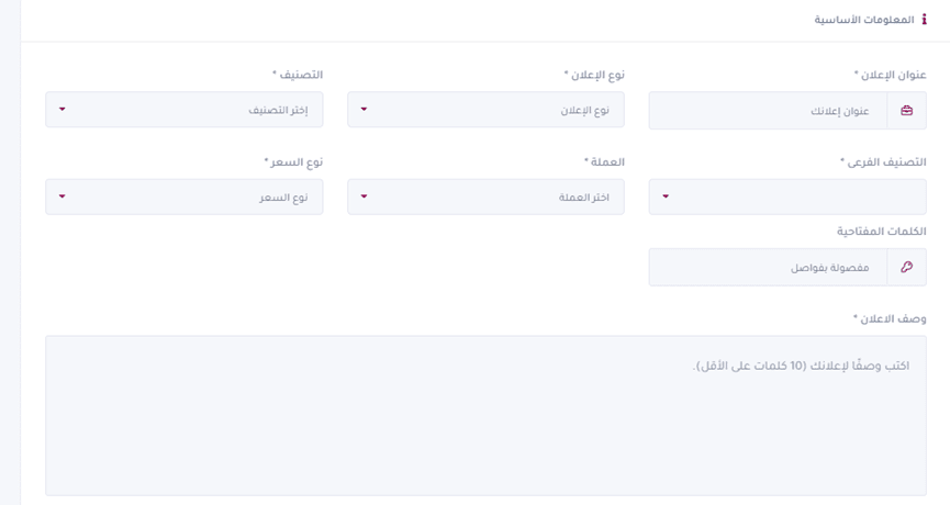 2- قم بعد ذلك بتسجيل معلومات الإعلان الذي ترغب بنشره (عنوان الإعلان، نوعه، التصنيف، العملة،..)