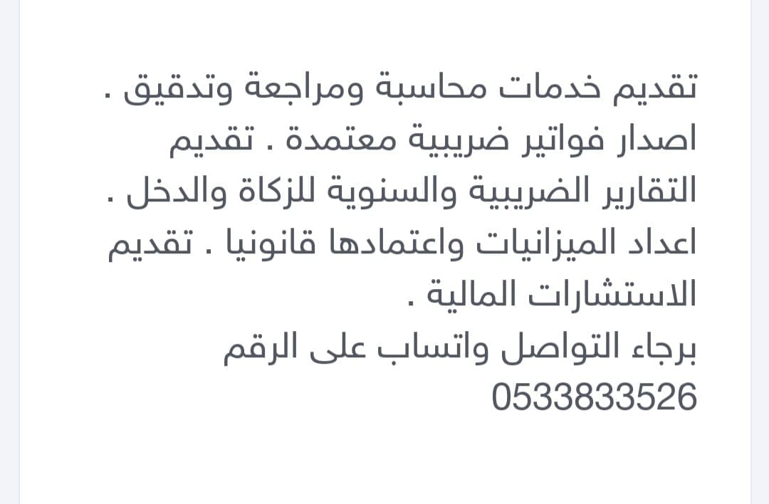 تقديم خدمات محاسبة و مراجعة وتدقيق . اصدار فواتير ضريبية معتمدة ، تقديم الاقرارات الضريبية والزكاة والدخل السنوية ،تقديم افصاحات بلدي، اعداد الميزانيات واعتمادها قانونيا ، تقديم الاستشارات المالية , برجاء التواصل واتساب