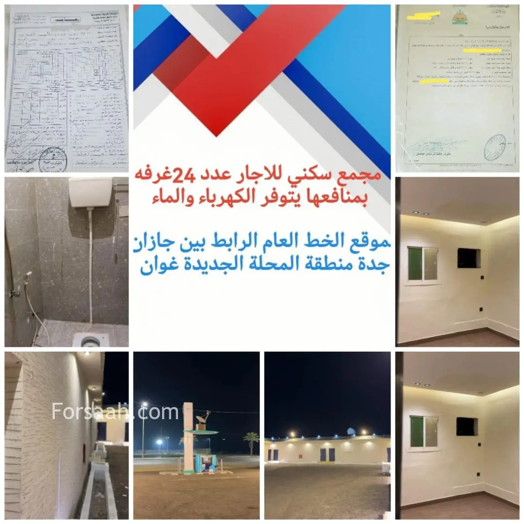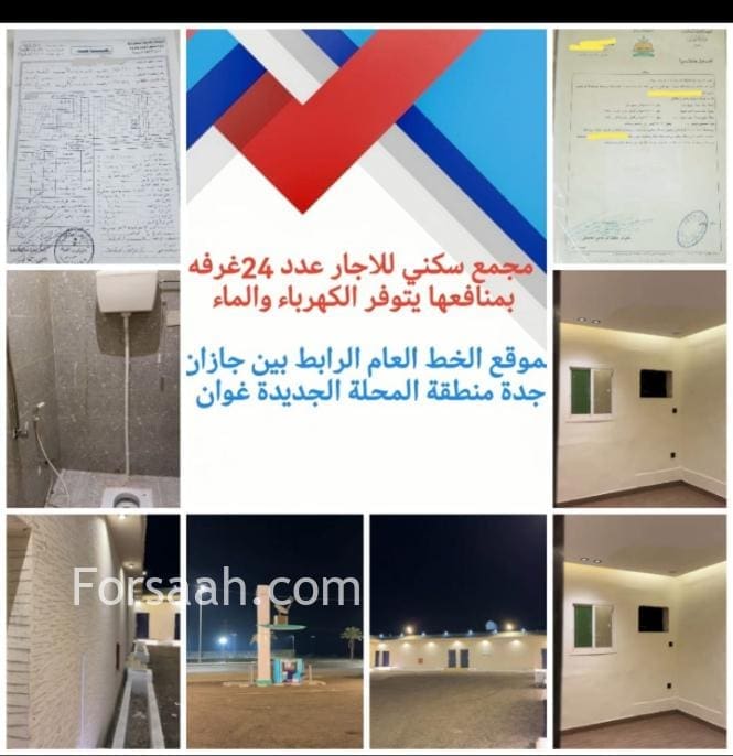 ترقية الآنمجمع سكني بموقع المحلة غوان يقع على الخط الرئيسي الرابط بين محافظة صبيا ومحافظة بيش بالمنتصف بعدد غرف 24غرفه وملحقاتها من دورات مياة اجلكم الله وديكور داخلي سقف جبسيات وإناره لد ومساحة المجمع ٤٦٧.٤٠متر مربع
