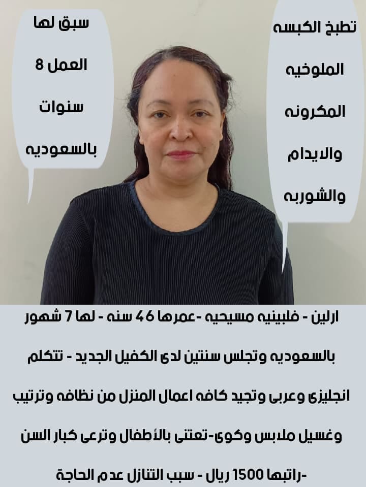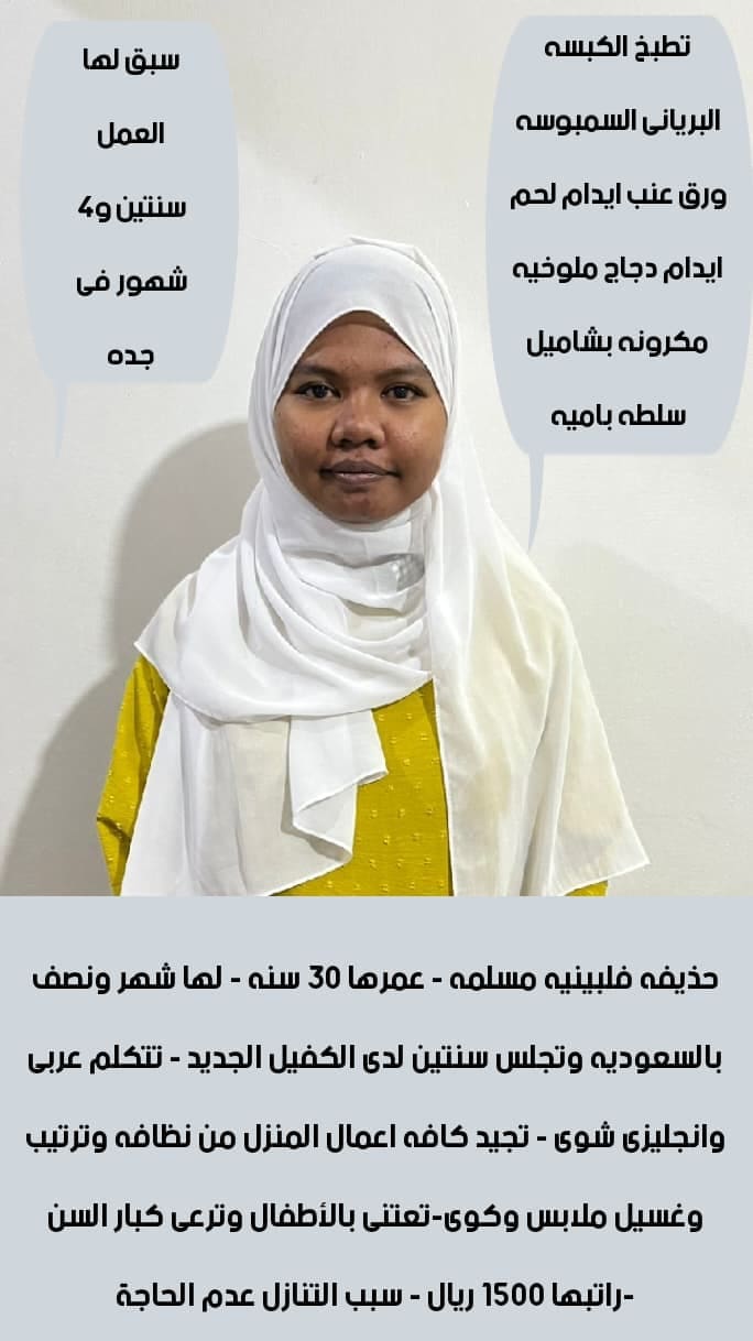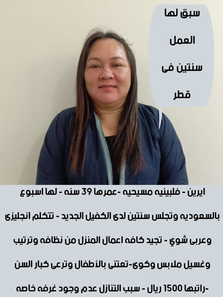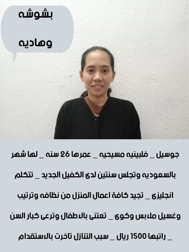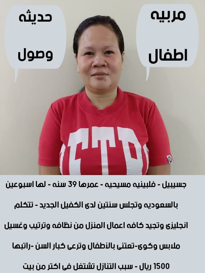 السلام عليكم ورحمه الله وبركاته اخواني واخواتي الاعزاء يوجد لدينا عاملات لتنازل وطباخات ومربيات لاطفال وحديث الولادة ومرافقات لكبار السن وزى الاحتياجات الخاصة وممرضات وكوافيرات على أعلى مستوى من المهاره ومتوفر لدينا من جميع الجنسيات لتواصل عبر الواتساب او اتصال هاتفي على مدار الساعة 0567728405