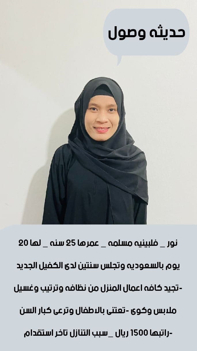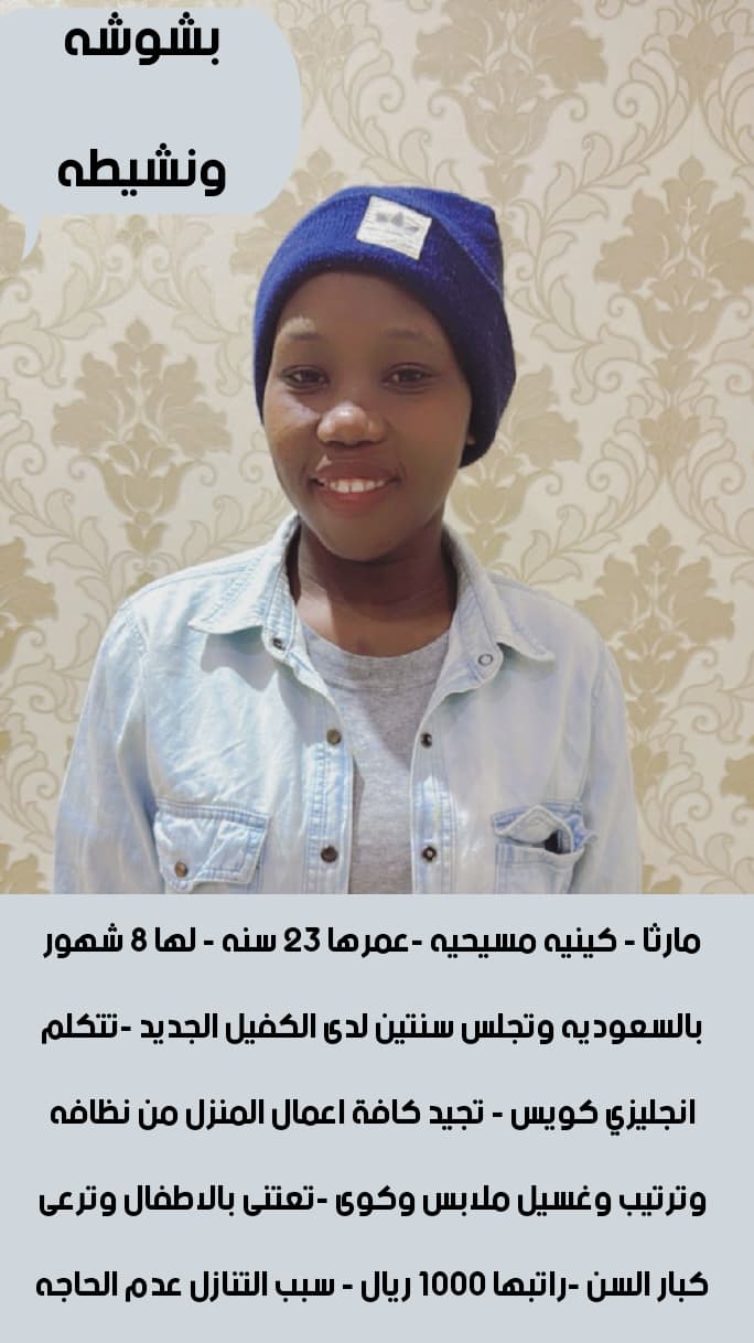 كما يوجد عاملات من اوغندا كينيا إثيوبيا بنجلاديش سيرلانكا فلبين للتنازل بأسعار ممتازه نقل كفالة ويوجد تجربه قبل النقل وتوصيل جميع مدن المملكه