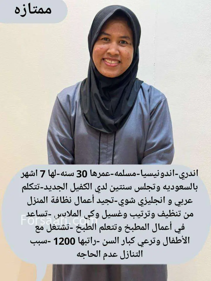 عامله اندونيسيا معها إقامة عمرها ٣٠ سبق لها العمل في السعوديه تتكلم عربي مسلمه تجيد جميع أعمال المنزل من ترتيب وتنظيف وغسيل وكي ومحبه للاطفال وترعي كبار السن للتوصل 0573099605